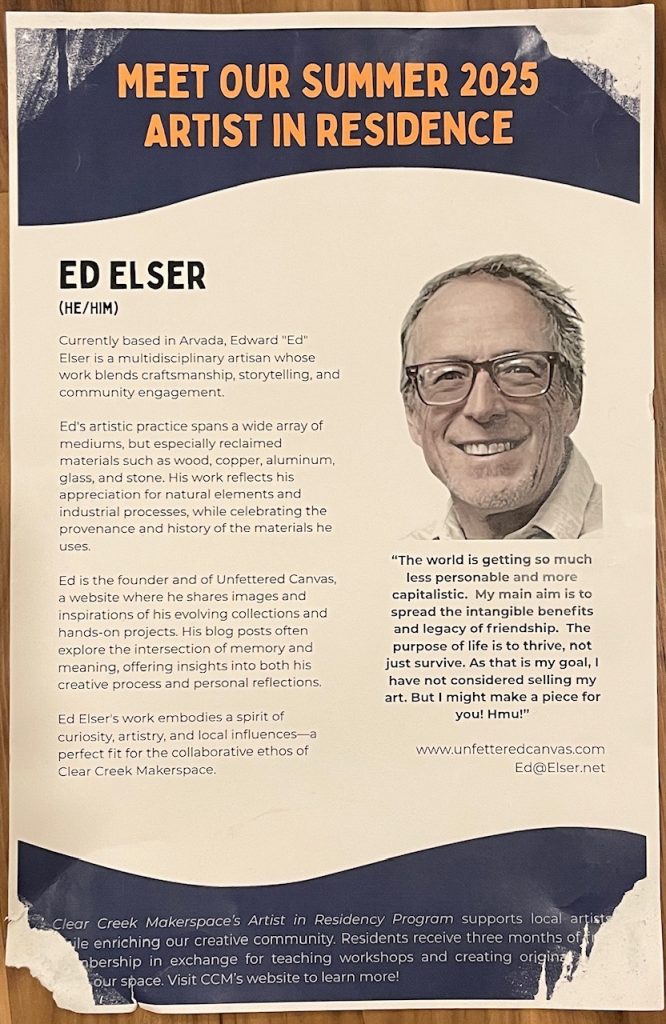 Here is the link the made on their site: https://clearcreekmakerspace.com/artist-in-residence/.. but as that will probably age out, I will put a screenshot here.